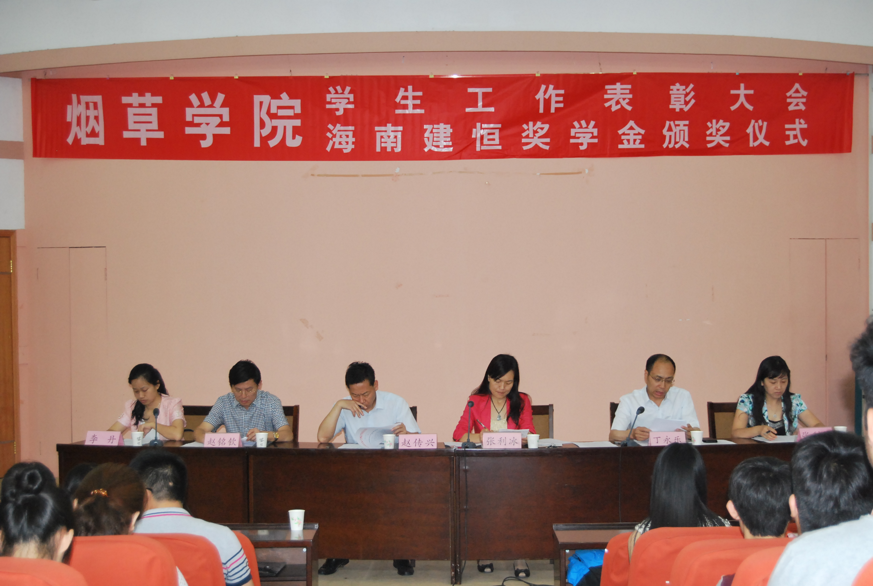 学生工作表彰大会暨海南建恒奖学金颁发仪式在礼堂300人报告厅举行。院党委书记赵传兴、副书记张利冰,副院长赵铭钦、丁永乐,办公室主任张利军出席会议,b次元