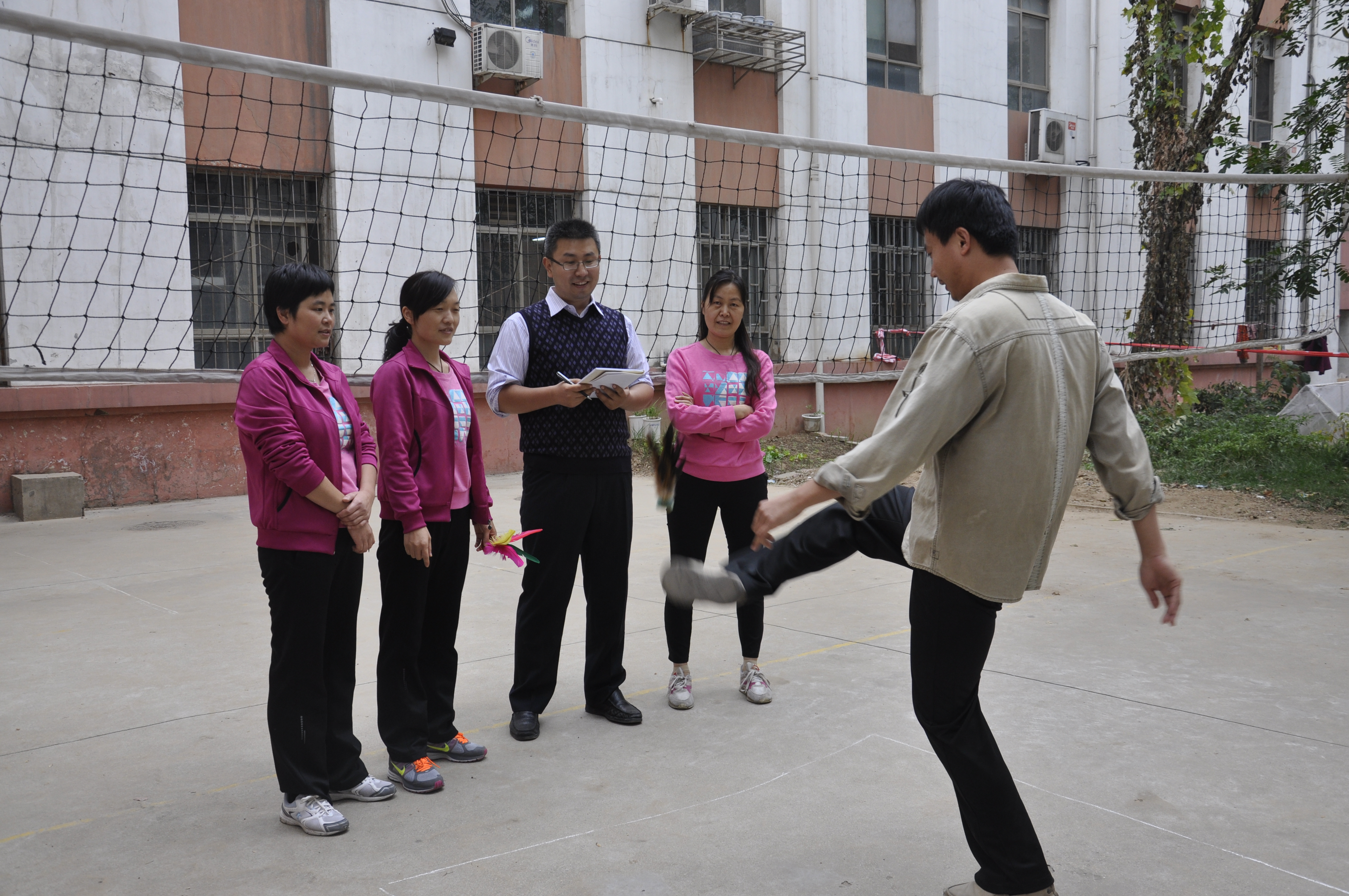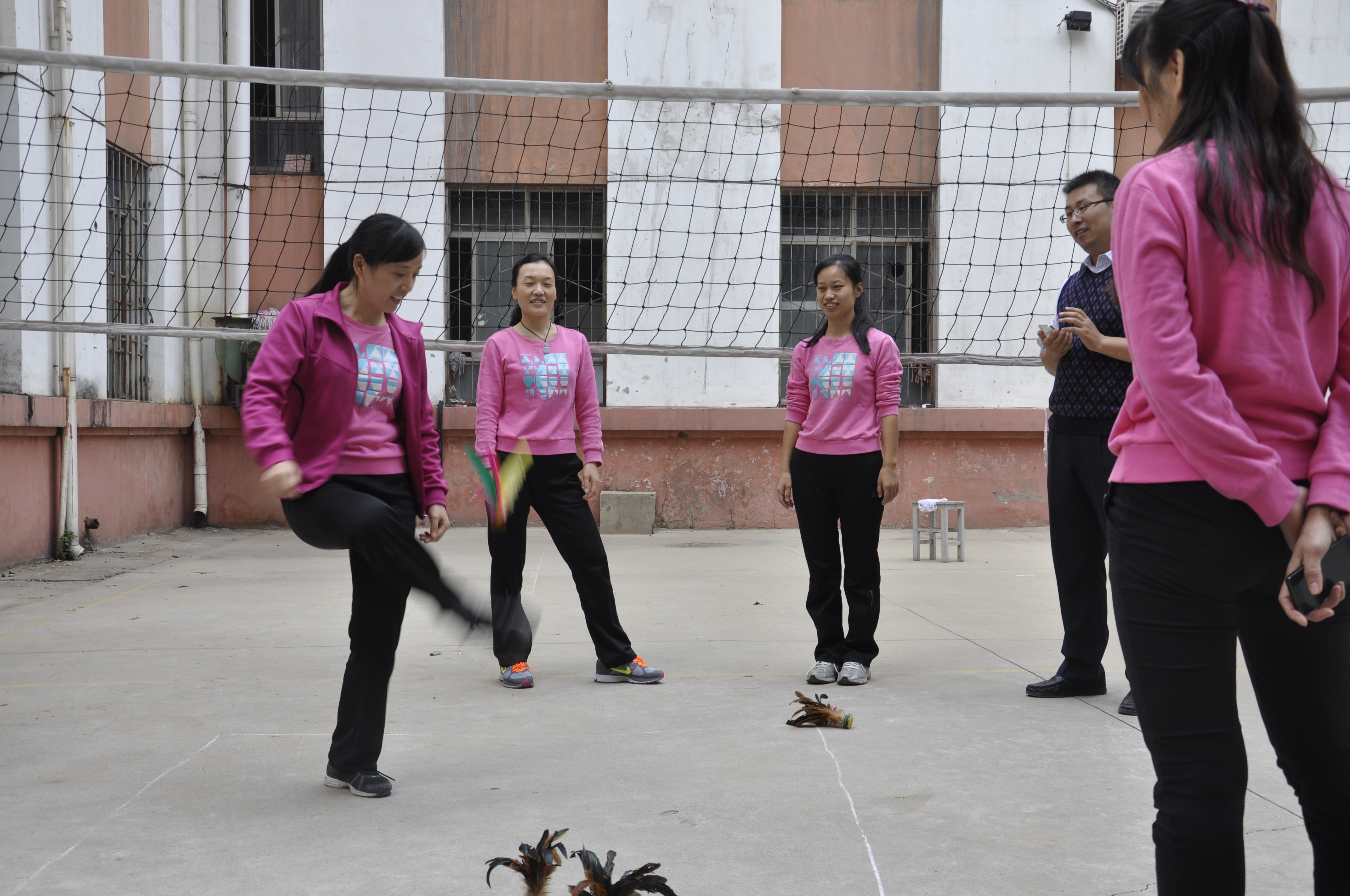 分工会在一号楼后举行了教职工踢毽子比赛,比赛按照2分钟计数,比赛中,教职工各个使尽浑身解数,用脚内侧踢、膝盖顶、脚外侧反踢、脚面勾、头顶,五彩的毽子上下翻飞,使比赛极具观赏性和趣味性。整个赛场欢声笑语此起彼伏,气氛热闹非凡。最终张利冰、张利军、杨永霞、焦桂珍、殷全玉分别取得女子前5名,张芊、谢东明、黄五星分别取得男子组前3名。