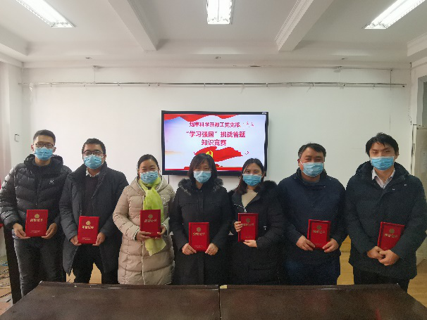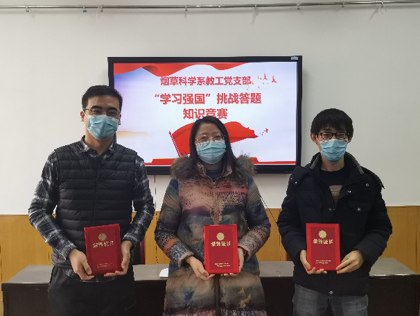 为更好地激发教工党员学习热情,发掘学习典型,总结学习经验,营造竞相学习的良好氛围,烟草科学系教工党支部于2021年1月22日开展了“学习强国”知识竞赛活动。经过激烈比拼,代晓燕老师赢得一等奖,丁松爽、王召军、遆晋松三位老师获得二等奖,姚鹏伟、薛刚、闫筱筱、党炳俊、王景、符云鹏、张小全、贾玮八位老师获得三等奖。作为河南省先进基层党组织,烟草科学系教工党支部通过本次活动以赛促学、以学促做,进一步夯实教工党员的理论基础,未来将进一步规范支部建设,拉高建设标杆,创新工作方式,加强党建和业务融合,在一流专业和一流课程建设上发挥示范带动作用,为b次元