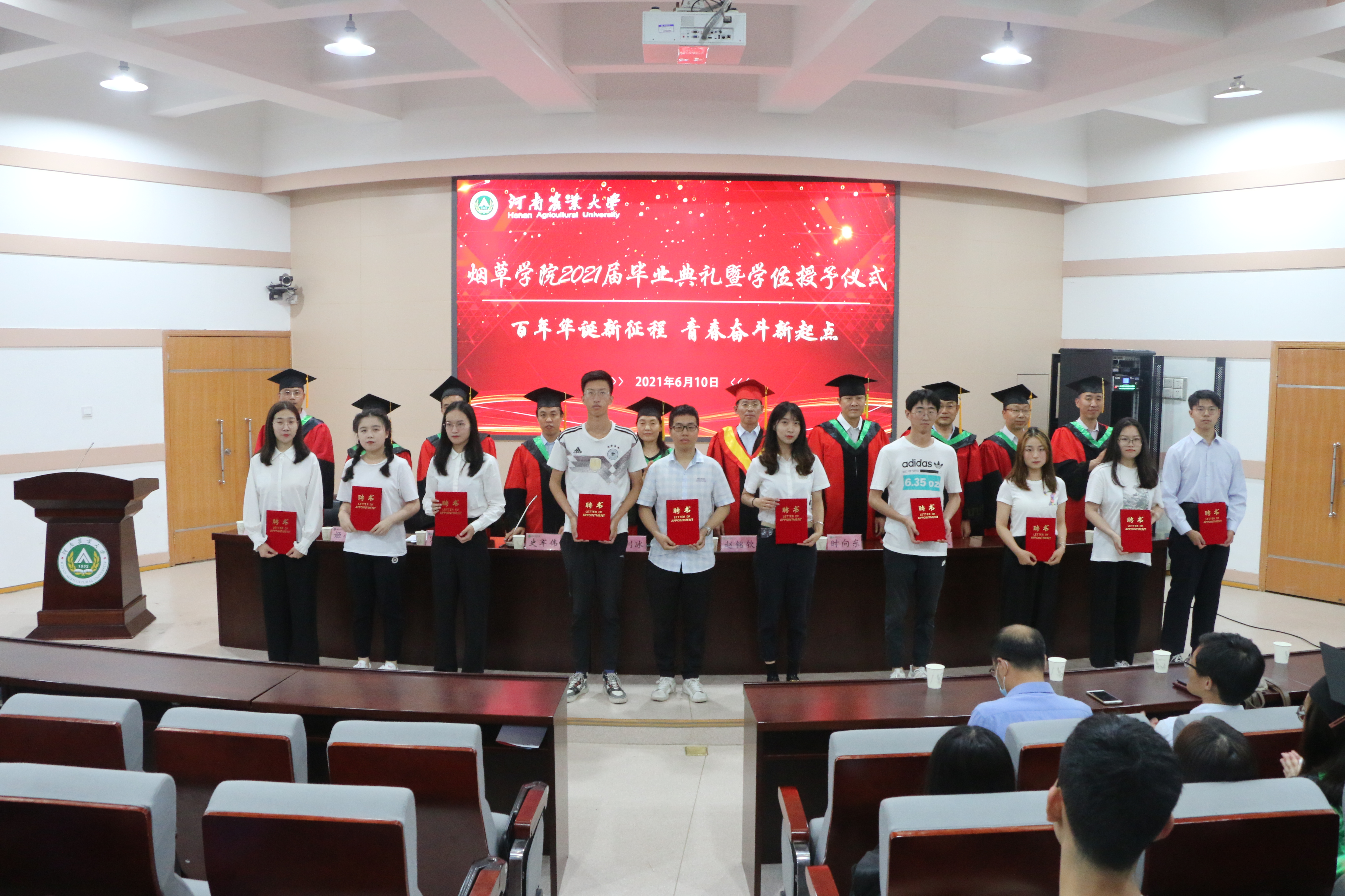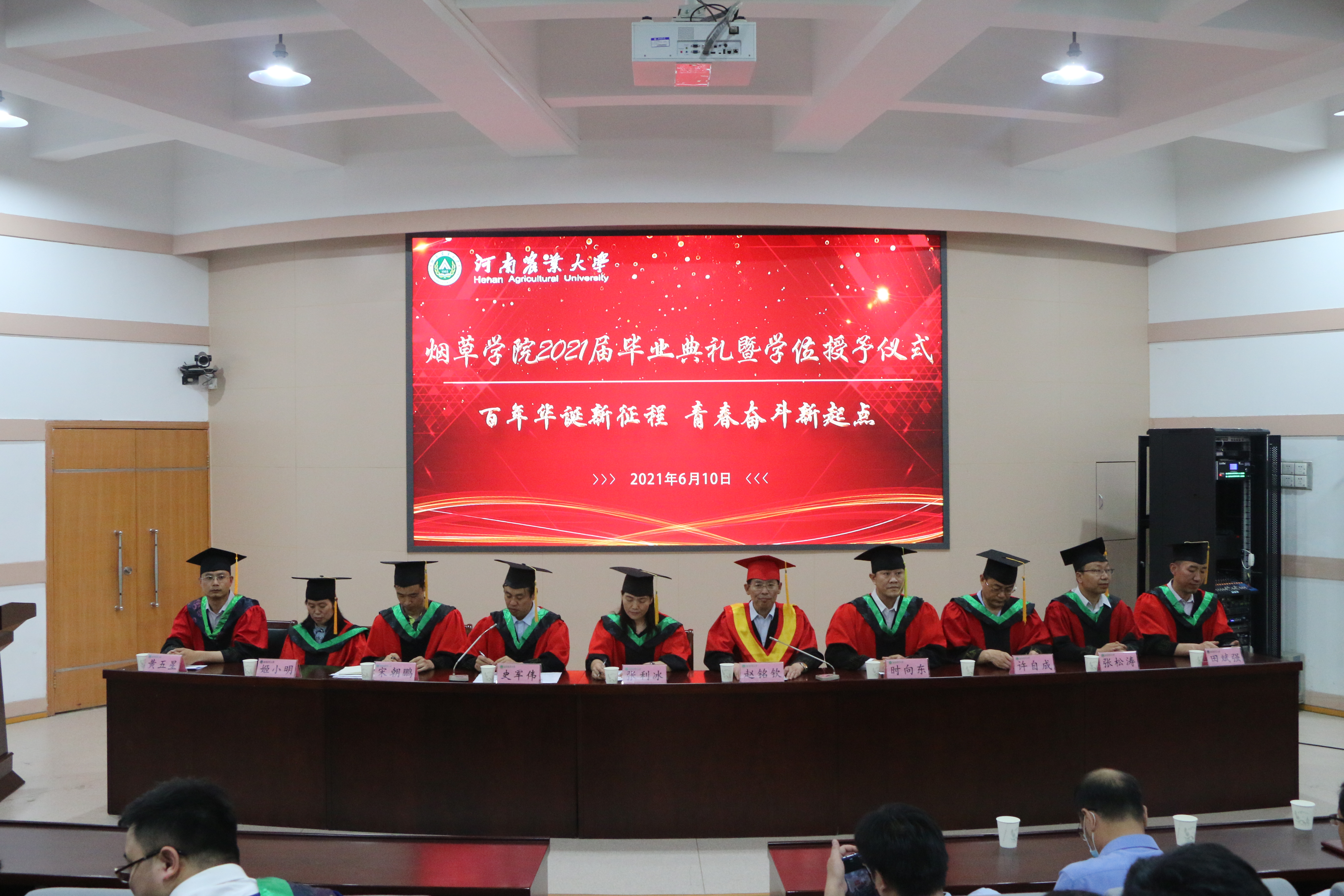 典礼在庄严的国歌声中拉开帷幕。院领导为校友联络员颁发聘书。副院长时向东、宋朝鹏宣读获得博士、硕士、学士学位学生名单。在欢快的乐曲声中,院学位委员会主席、院长赵铭钦为博士研究生一一拨正流苏,颁发学位证书。院领导、院学术委员会委员为取得学位的硕士研究生、本科毕业生拨正流苏、颁发学位证书。2018级硕士研究生罗勇、烟草17-1班和顺作为学生代表先后进行发言,分享了自己在学校、学院的成长,表达了对母校的感恩之情。烟草科学系主任黄五星作为教师代表上台发言,为毕业生送上衷心祝福。