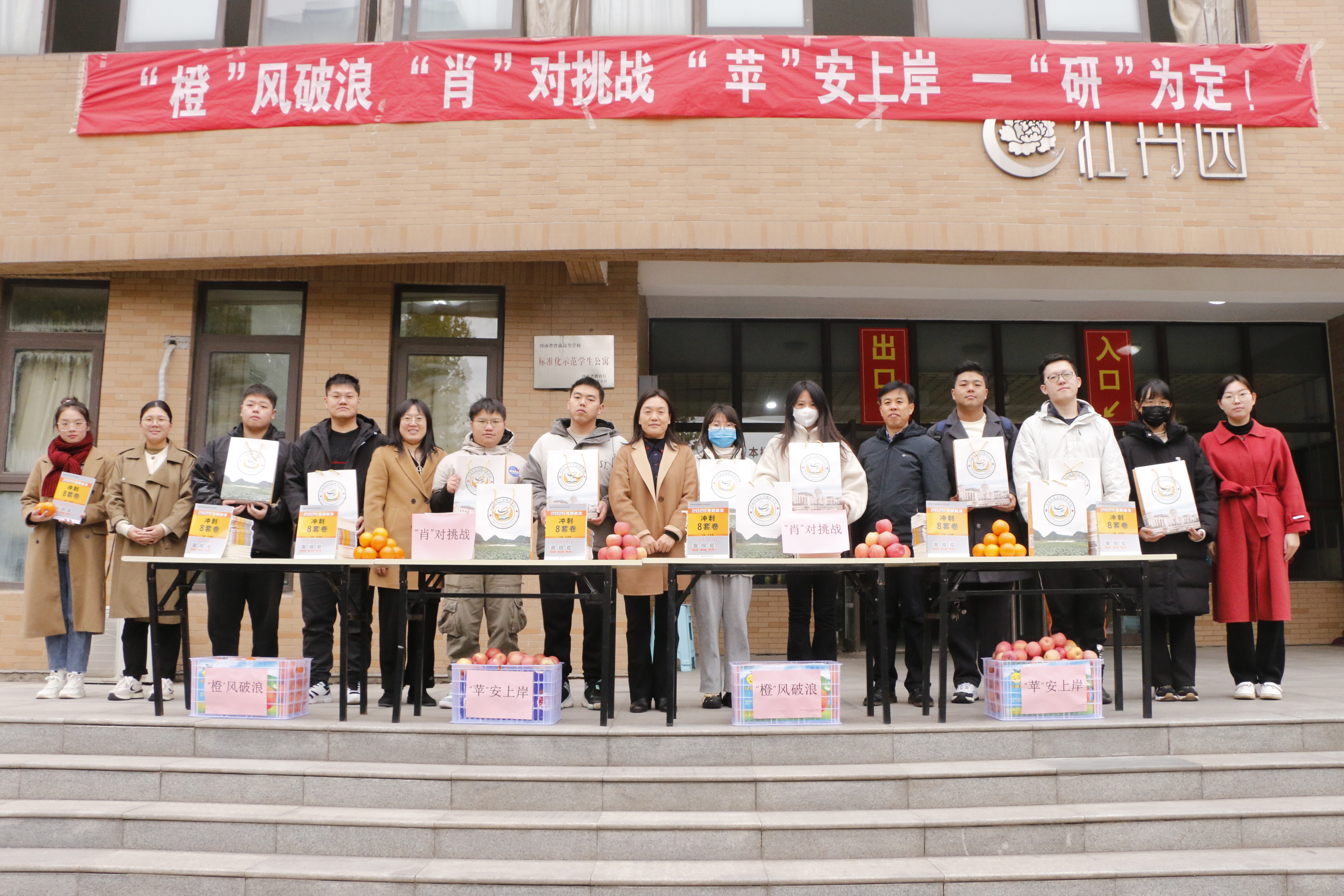 寒冬已至,备战已久的考研学子迎来了紧张的冲刺阶段。为鼓舞考研士气,减轻同学们的焦虑,增强大家考研的信心。11月10日,b次元 在龙子湖校区牡丹园门口开展“‘橙’风破浪 ‘肖’对挑战 ‘苹’安上岸 一‘研’为定”冬季送温暖活动,为2024届考研学生送上冬日最温暖的祝福。学院党委书记张利冰、党委副书记史军伟及全体辅导员老师出席活动,学院2024届学生代表参加活动。