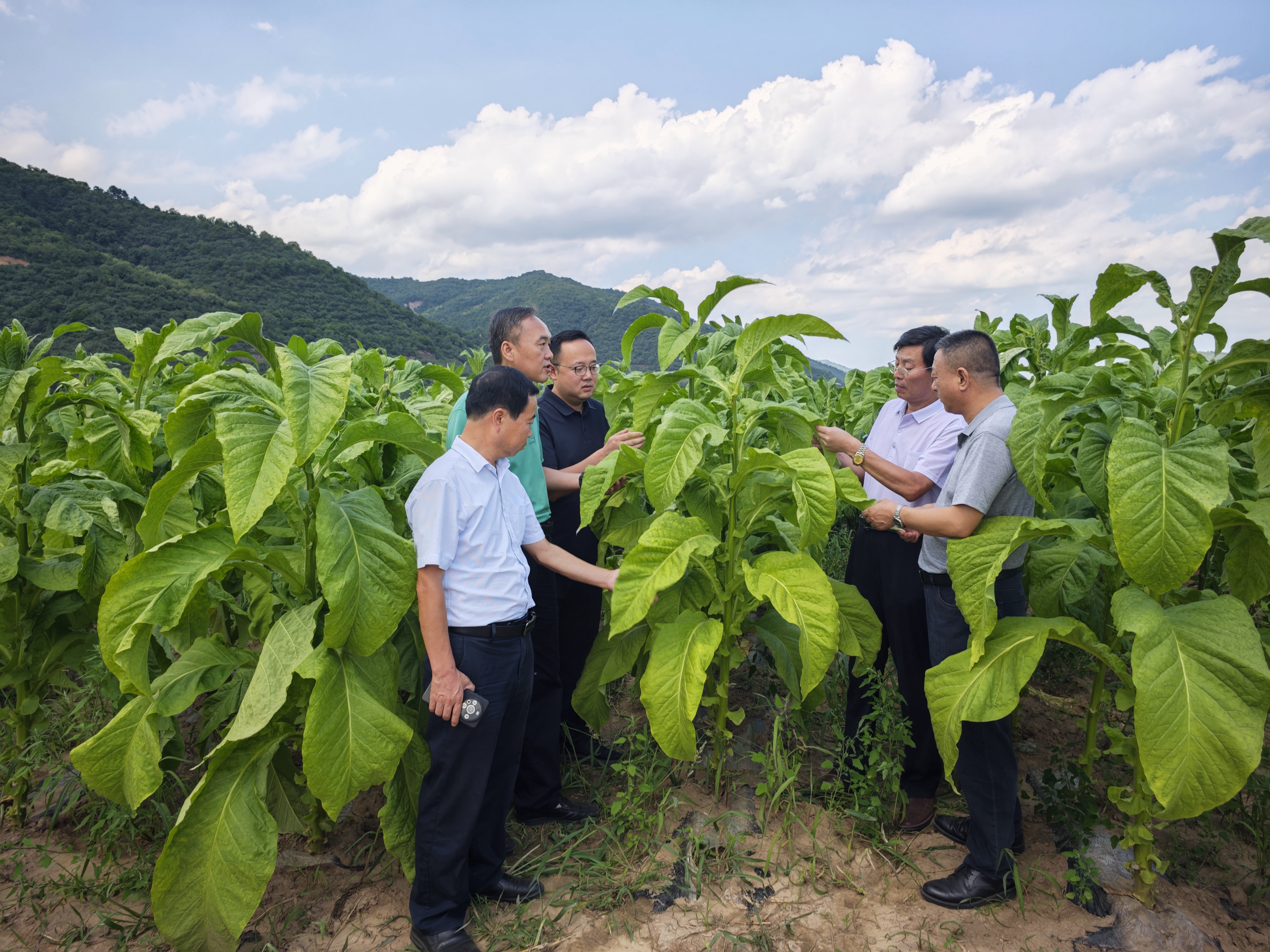 赵铭钦一行到马栏村烟田实地调研,查看烟叶长势、田间管理和成熟采烤,与烟农交流。在纸坊村查看品种试验、促根剂试验、肥料试验、密度试验开展情况。