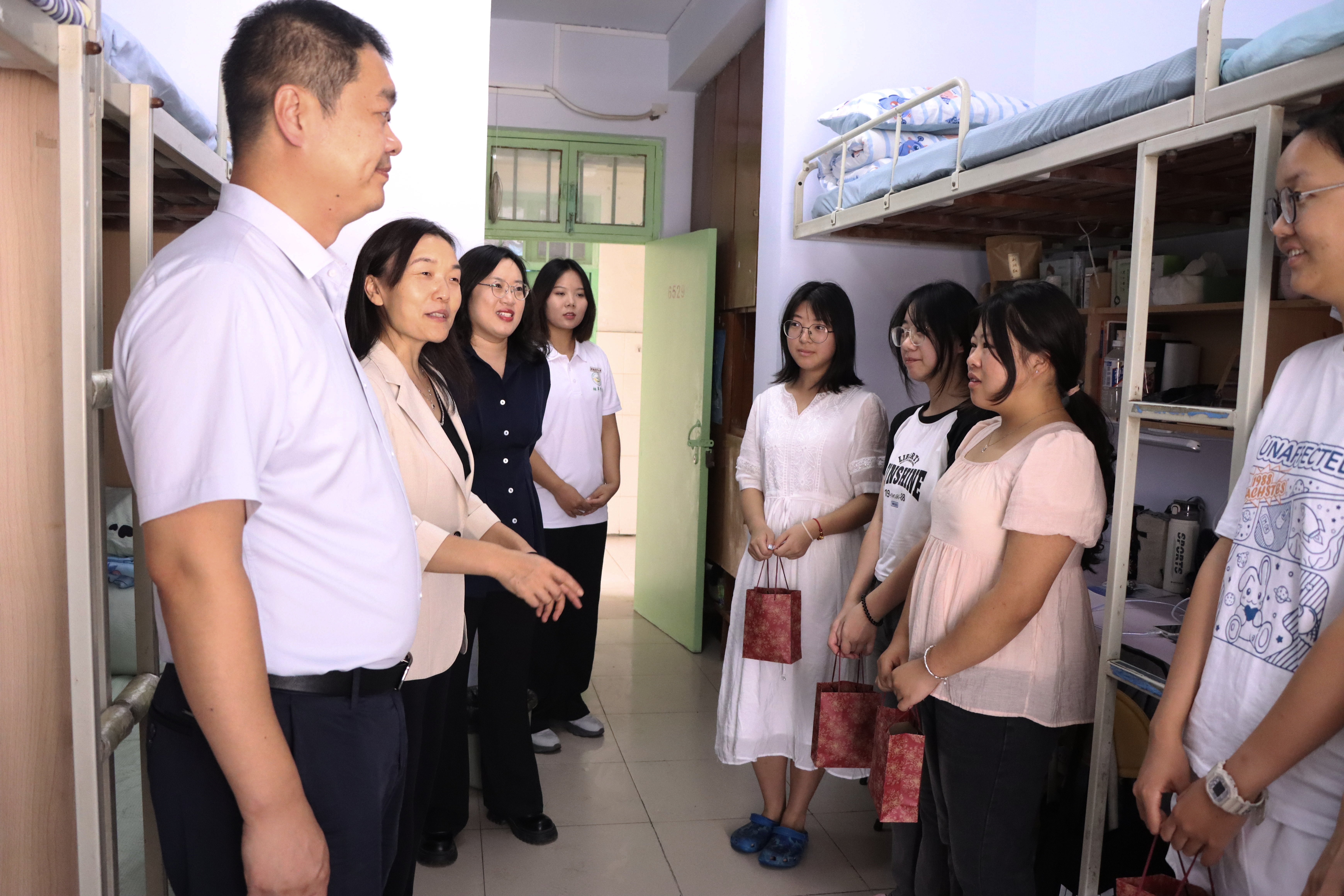 每到一处,张利冰都为大家送上学院精心准备的中秋月饼和水果套装,在与同学们亲切交谈中,详细询问大家的学习、生活、军训情况,关心大家的身体和心理健康,并鼓励同学们珍惜大学时光,努力学习专业知识,为将来为社会做贡献打下坚实的理论基础。张利冰向同学们送上节日的美好祝福,并通过同学们向家长们表达亲切慰问。老师们在走访过程中,认真倾听了同学们在学习和生活中遇到的困难,针对大家提出的具体问题进行了耐心细致的解答。对学生们感兴趣的学校规章制度、课程安排等问题都给予了详细的指导和建议。