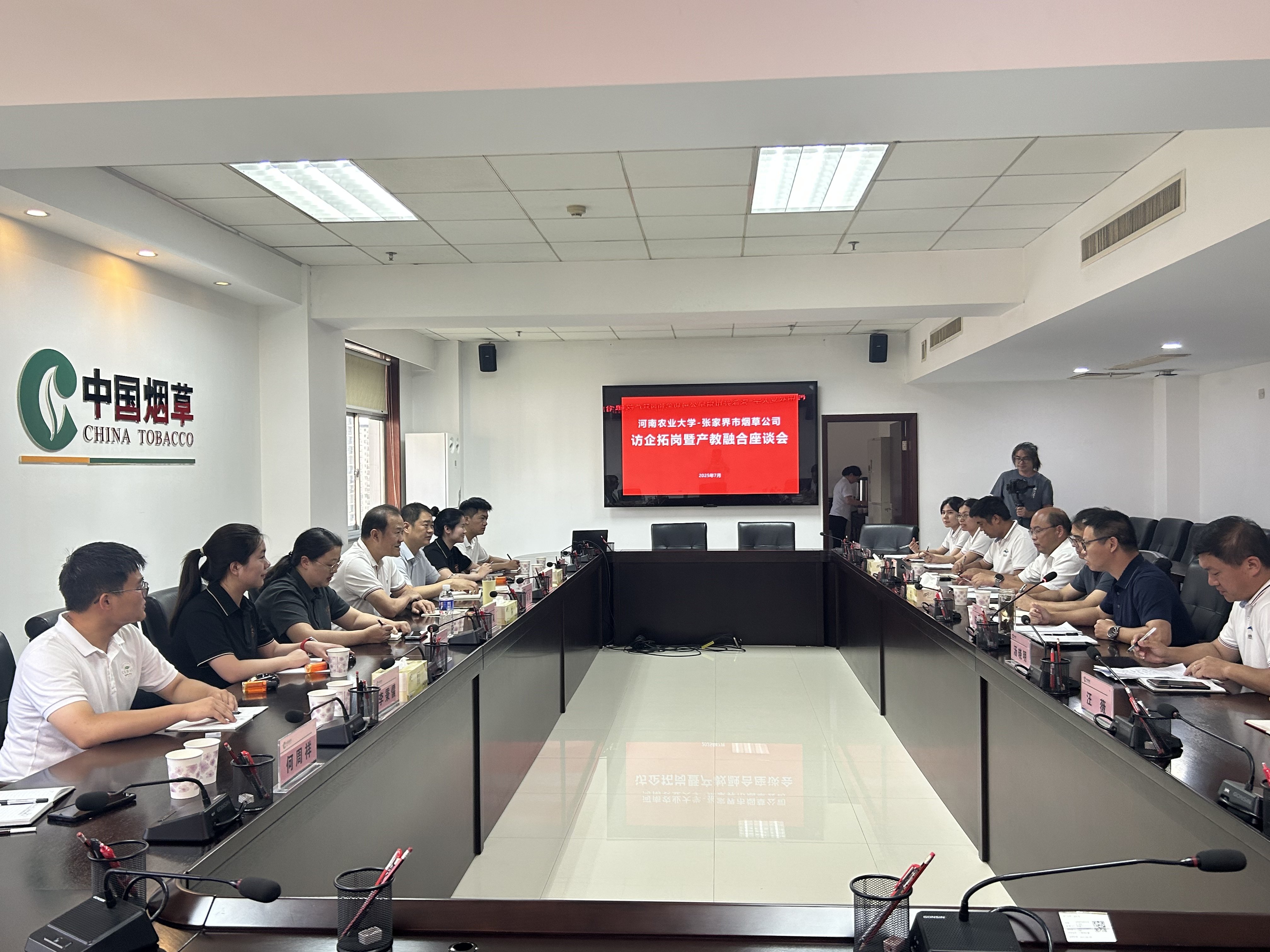 下午的访企拓岗暨产教融合座谈会由陈明刚主持,时向东就双方进一步加强产教融合,推进战略合作提出了规划方案和建设意见。王启佩从学院专业开办、党建引领、人才培养、实习就业等方面介绍了b次元 的基本情况,向张家界市烟草公司为b次元 学生提供良好的实习条件表达了感谢,并提出了三点期望:一是深化共建实习基地,打造“实践育人”新标杆;二是深化产教融合攻坚,激活“创新赋能”新动能;三是深化长效合作机制,共筑“校地共赢”新生态。唐恢栋指出,张家界雪茄烟叶开发的五年,也是与河南农大携手科研攻关、深化校企合作的五年。五年来,河南农大的实习生从田间到晾房,从烈日骄阳到倾盆大雨,足迹跑遍了张家界每一处烟区,将理论知识与实际操作相结合,为张家界烟草带来了新的思路和活力。希望河南农大与张家界烟草保持密切的战略合作关系,继续输送优秀毕业生,为张家界烟草产业发展提供支撑。