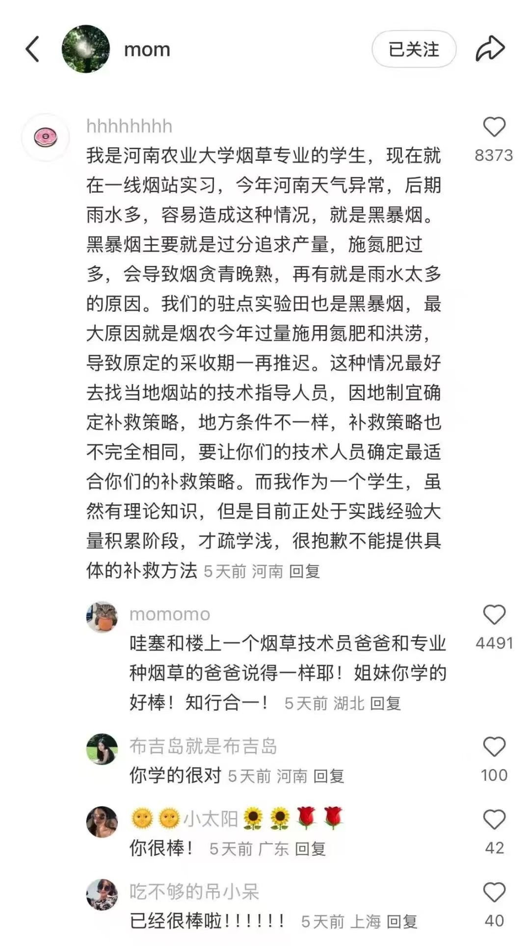 看到一位烟农父亲因为烟叶迟迟不落黄而发帖求助时,我心里很不是滋味。我第一反应就是翻开自己期末复习时做的笔记,把可能的原因和一些建议写在留言里。后来发现有不少人的判断和我相近,我也更坚定了自己的想法。看到大家都愿意拿出所学去帮一位素不相识的农民,我觉得特别暖心。能用所学知识替烟农解燃眉之急,我不光有一种帮到人的成就感,也真切地为自己的专业和母校感到骄傲。 或许,这片烟田的最终结果还需要时间,但在这个过程中,河南农大学子的专业与温情已经写下了一份动人的答卷。
