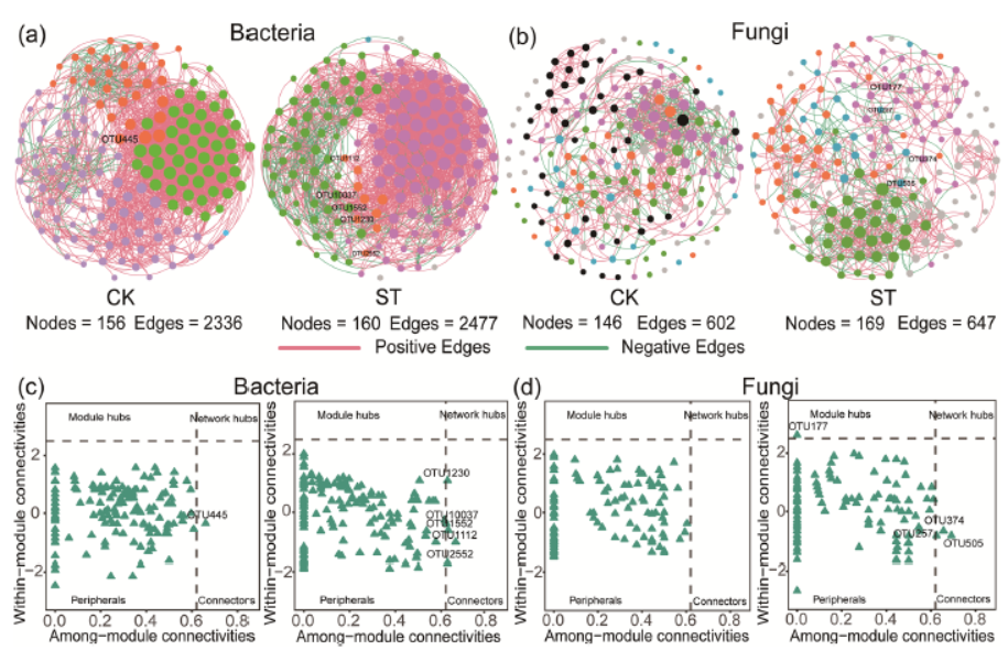 研究发现一:揭示生物炭对土壤微生物共现网络(Co-occurrence Network)的差异化调控机制。基于复杂网络拓扑分析,研究团队证实长期施用生物炭显著增强烟株根际细菌网络的复杂性与稳定性,核心微生物类群数量明显增加。该研究从微生态系统“互作网络”的视角,明确了生物炭通过强化微生物协同关系、构建更稳定的土壤微生态结构,从而增强土壤对环境扰动的抵抗能力,为破解烟草连作障碍提供了新的土壤微生态学视角。