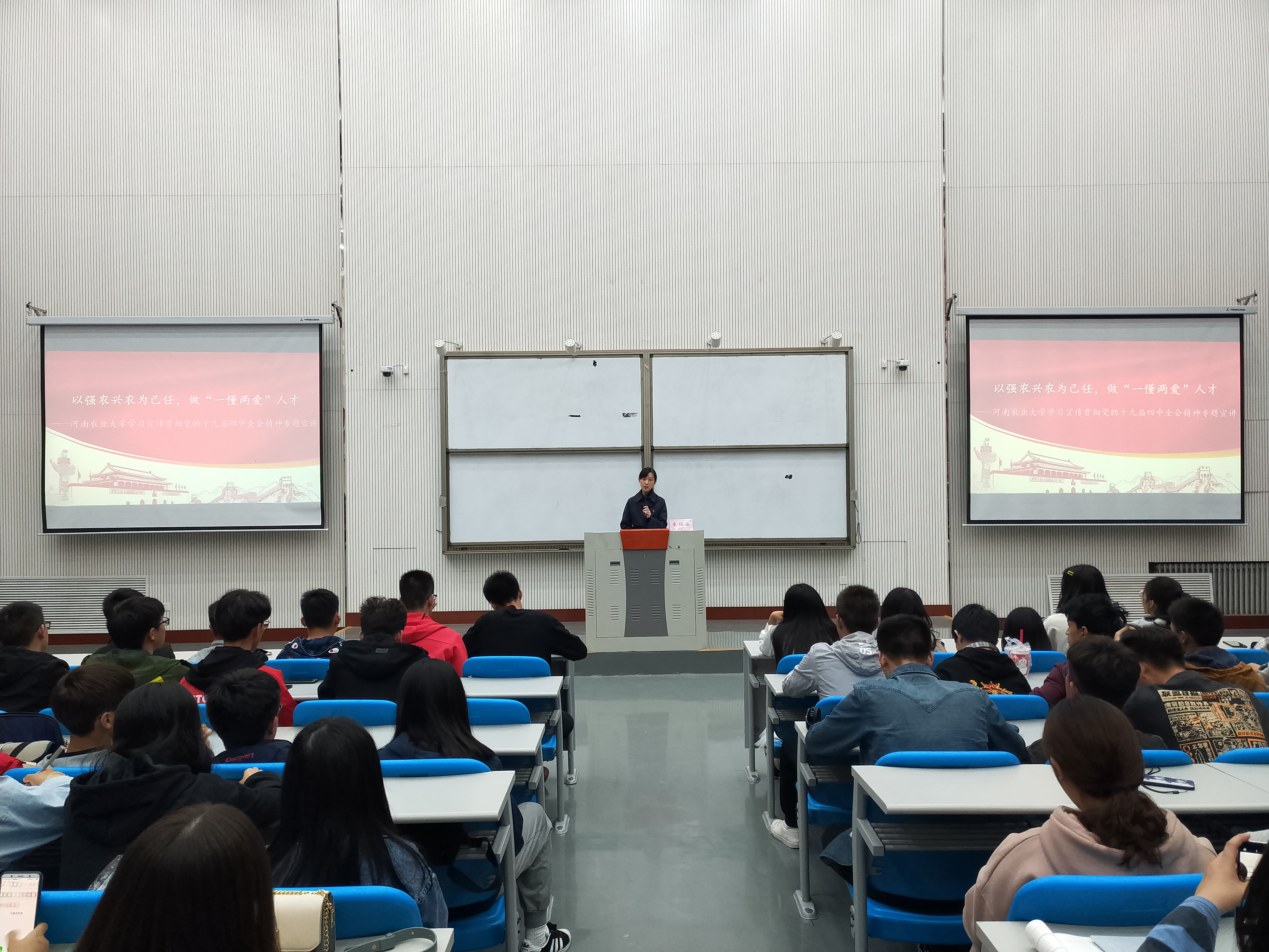 为进一步贯彻落实党的十九届四中全会精神和省委书记王国生到b次元 调研座谈讲话精神,11月10日晚,b次元 于繁塔楼大教室4举办以“以强农爱农为己任,做‘一懂两爱’人才”为主题的学习贯彻党的十九届四中全会精神宣讲会。此宣讲会邀请文法学院朱瑞萍辅导员主讲,19级辅导员温心怡出席,19级全体学生参加。