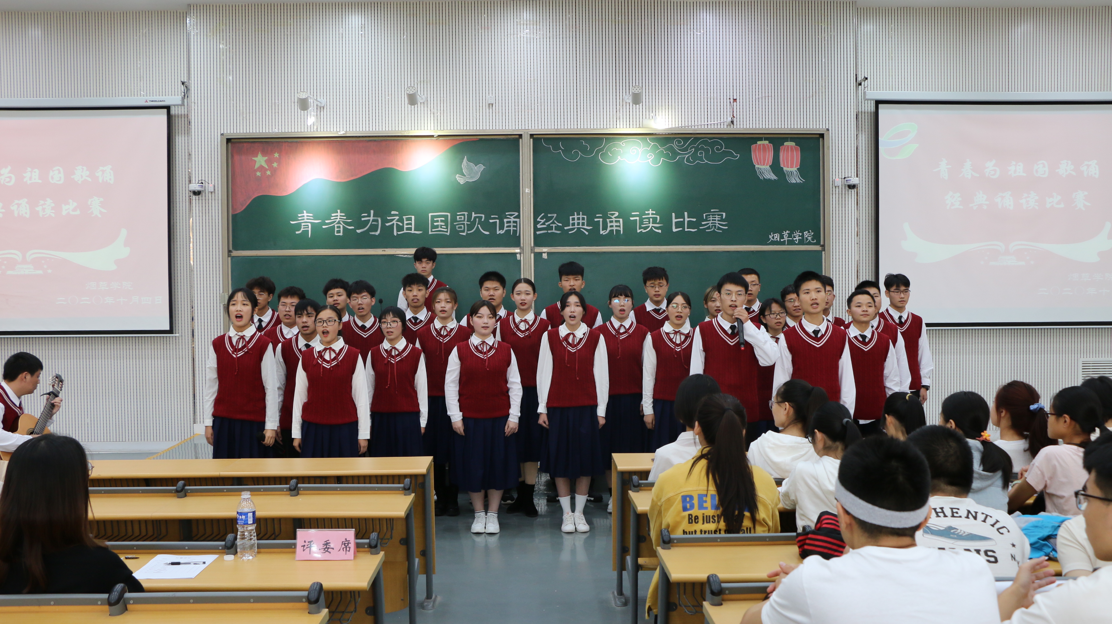 比赛在烟草20-4班声情并茂的朗诵中拉开序幕,一首《我们为祖国歌咏》燃起在场所有人的爱国之情。烟工20-1班的《抗疫之战》歌诵了全国人民齐心协力,抗击新冠肺炎疫情斗争取得重大战略成果。中场歌曲《我和我的祖国》传递了发自内心的自豪感和对祖国母亲的热爱之情。烟草20-3班的《青春助力中国梦》赞颂了不同青春谱写的中国梦,一代代拼成的中国梦。烟工20-2班为祖国深情朗诵《赞祖国巍峨屹立》,激昂的朗诵声在空中回荡。最后,同学们共同观看了b次元 为祖国71周年华诞献礼MV《中国》,朗诵比赛圆满落下帷幕。
