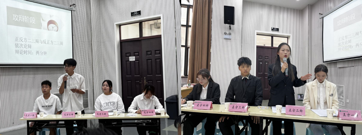 本次比赛主要围绕“面对精神内耗我们更需要接纳自己or鞭策自己”这一辩题展开激烈论述。双方辩手唇枪舌战、针锋相对,从自由攻辩到总结陈词,双方逻辑严密、言语犀利。观赛学生激情澎湃、掌声连连响起,现场氛围热烈。
