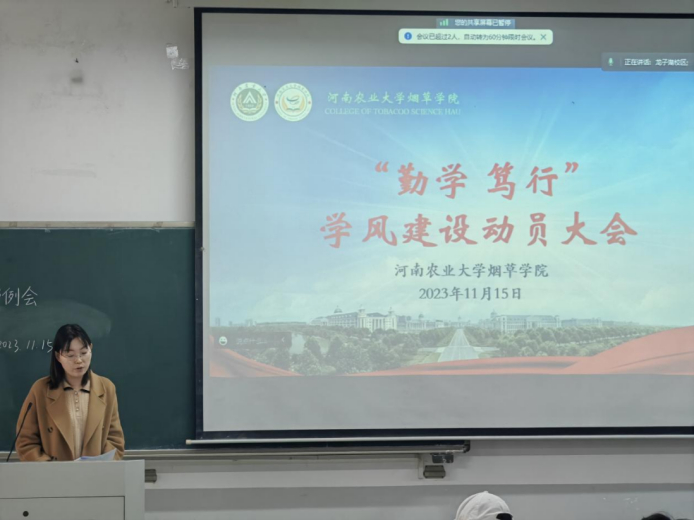 于龙子湖校区和桃李园校区同时举办开展学风建设动员大会,学院团委老师崔静宇、胡旦旦及全体学生干部和班委参会,会议由院团委书记王雪婧主持。