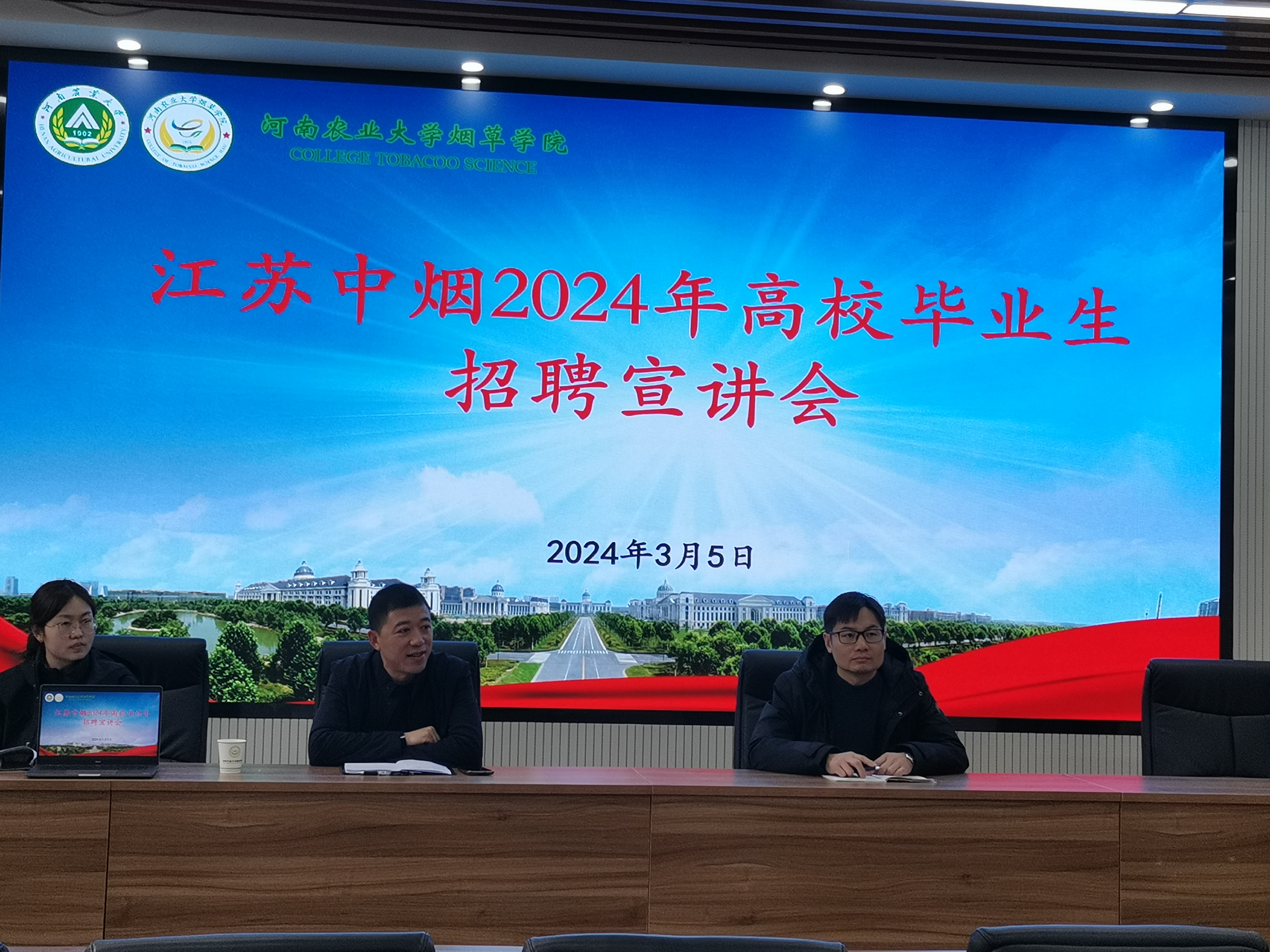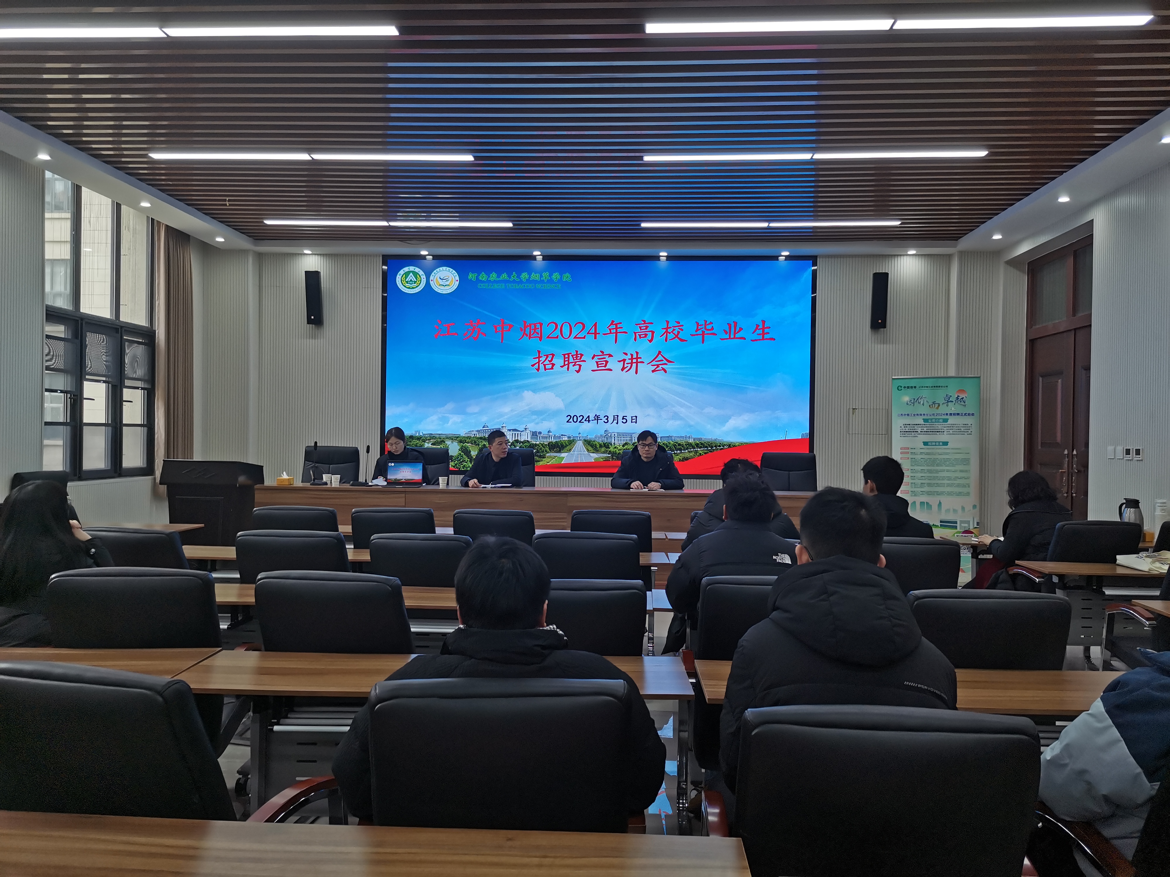 于龙子湖校区第二实验楼南229举办江苏公司企业校园招聘宣讲会。部分2024届毕业生参加会议,会议由江苏中烟工业有限责任公司的全资子公司江苏鑫源烟草薄片有限公司的相关工作人员主持。