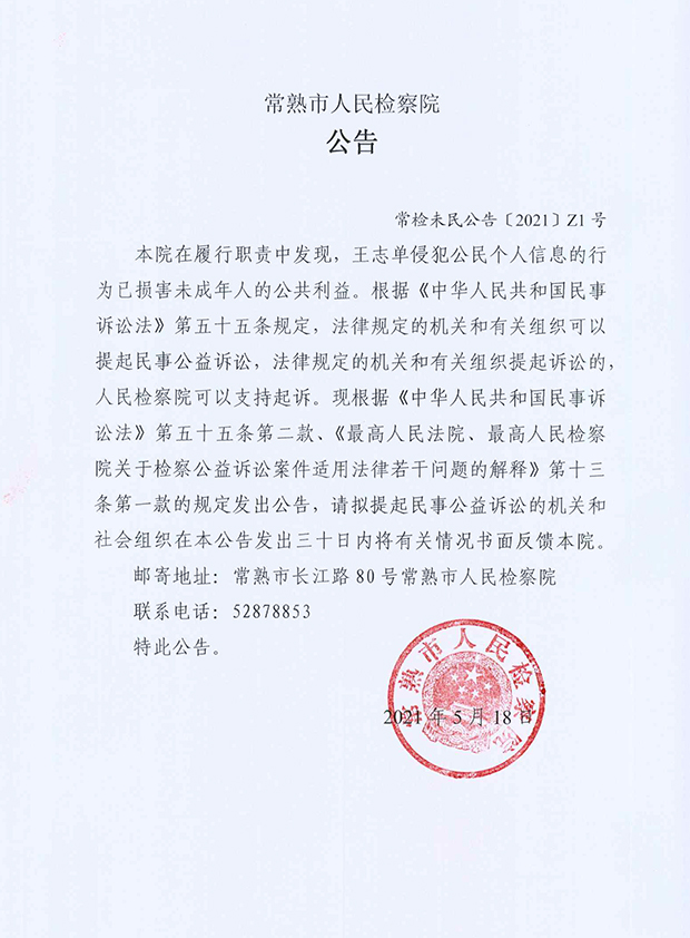 本院在履行职责中发现,王志单侵犯公民个人信息的行为已损害未成年人的公共利益。根据《中华人民共和国民事诉讼法》第五十五条规定,法律规定的机关和有关组织可以提起民事公益诉讼,法律规定的机关和有关组织提起诉讼的,人民检察院可以支持起诉。现根据《中华人民共和国民事诉讼法》第五十五条第二款、《最高人民法院、最高人民检察院关于检察公益诉讼案件适用法律若干问题的解释》第十三条第一款的规定发出公告,请拟提起民事公益诉讼的机关和社会组织在本公告发出三十日内将有关情况书面反馈本院。