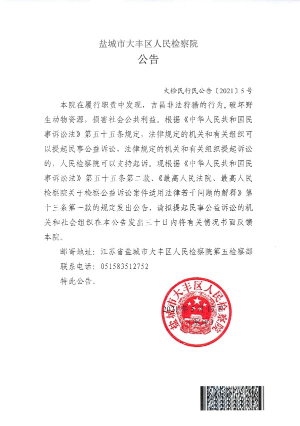 本院在履行职责中发现,吉昌非法狩猎的行为,破坏野生动物资源,损害社会公共利益。根据《中华人民共和国民事诉讼法》第五十五条规定,法律规定的机关和有关组织可以提起民事公益诉讼,法律规定的机关和有关组织提起诉讼的,人民检察院可以支持起诉。现根据《中华人民共和国民事诉讼法》第五十五条第二款、《最高人民法院、最高人民检察院关于检察公益诉讼案件适用法律若干问题的解释》第十三条第一款的规定发出公告,请拟提起民事公益诉讼的机关和社会组织在本公告发出三十日内将有关情况书面反馈本院。