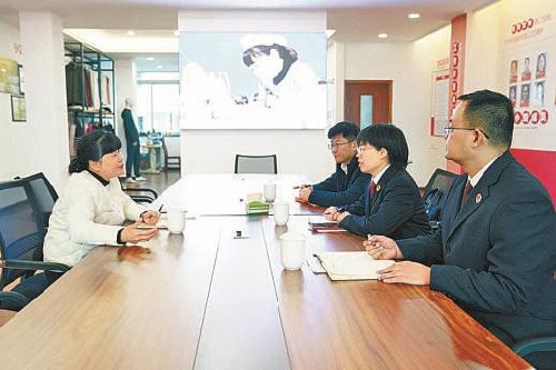 江苏省常州市新北区检察院干警走访全国人大代表李承霞(左),向代表征求女职工劳动和社会保障权益保护方面的建议。