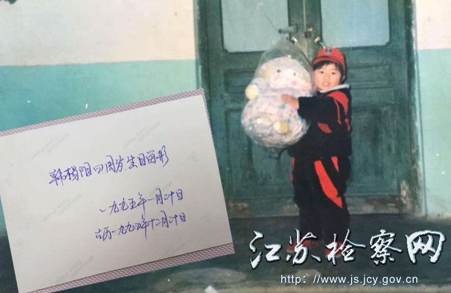 韩杨阳4岁时的生日留影,在照片背面还有父亲的留言笔迹