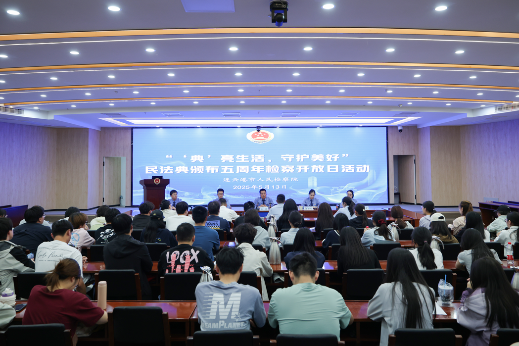5月13日下午,值《民法典》颁布五周年之际,江苏省连云港市检察院举办“‘典’亮生活,守护美好”民法典颁布五周年检察开放日活动。活动邀请市人大代表、江苏海洋大学文法学院师生代表共90余人走进检察机关,通过沉浸式体验与互动交流,感受《民法典》实施五周年成果,共话法治建设新篇章。