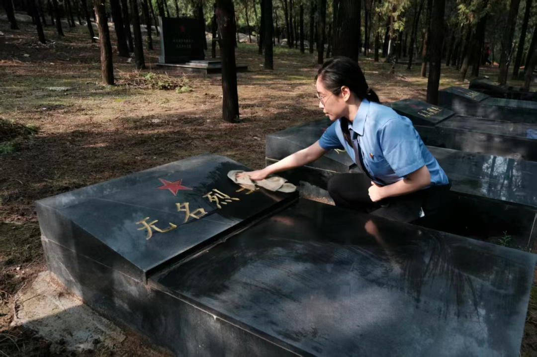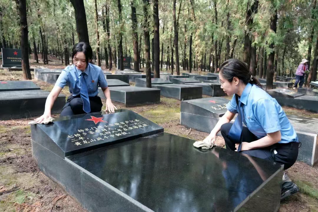徐庄镇洞山烈士陵园内树木挺立,气氛庄重。干警们携带抹布、水桶等工具,有序来到烈士墓碑前,逐一擦拭墓碑表面的杂物与灰尘,仔细清理碑文上的污渍,确保墓碑外观整洁。
